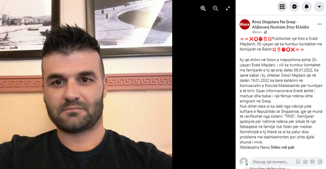 Erald Mejdani është larguar nga shtëpia në Ballsh datën 8 janar dhe që nga ajo ditë i ka humbur kontaktet me familjarët. Babai i tij ka bërë denoncimin në polici. Kjo e fundit është vënë në kërkim të 35-vjeçarit, baba i një fëmije. Ende është e paqartë nëse ka dalë nga territori shqiptar.