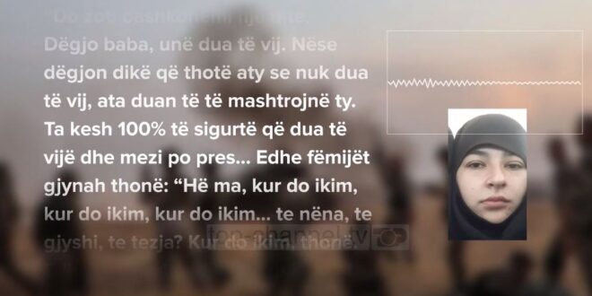Elona: “Do zoti bashkohemi një ditë. Dëgjo baba, unë dua të vij. Nëse dëgjon dikë që thotë aty se nuk dua të vij, ata duan të të mashtrojnë ty. Ta kesh 100% të sigurt që dua të vijë dhe mezi po pres… Edhe fëmijët gjynah thonë: “Hë ma, kur do ikim, kur do ikim, kur do ikim… te nëna, te gjyshi, te tezja?Kur do ikim,thonë. Edhe ju mendoni që unë nuk dua të rikthehem. Mezi po pres, as mos e ço në mëndje që nuk dua. Plus unë jam e sëmurë, kam dhimbje, nuk e di çfarë kam, apandesit a ndonjë gjë kushedi çfarë dhe dua të vij të vizitohem se këtu është problem. Të shkosh të vizitohesh edhe vjen puna ‘allah allah’ të fusin ndonjë gjilpërë për të vd .ekur. Kam frikë të shkoj të vizitohem, nuk shkoj dot”.