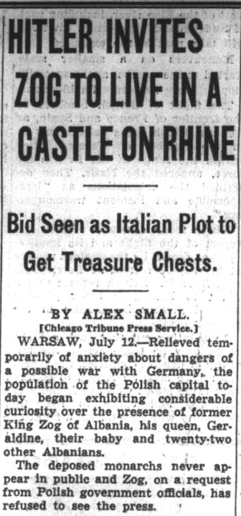“Chicago Daily Tribune” ka botuar, të enjten e 13 korrikut 1939, në faqen n°10, një shkrim rreth kurthit që nazistët kishin ndërmend të organizonin ndaj Mbretit Zog dhe familjes mbretërore shqiptare asokohe në Varshavë, të cilin, Aurenc Bebja, nëpërmjet blogut të tij “Dars (Klos), Mat – Albania”, e ka sjellë për publikun shqiptar :