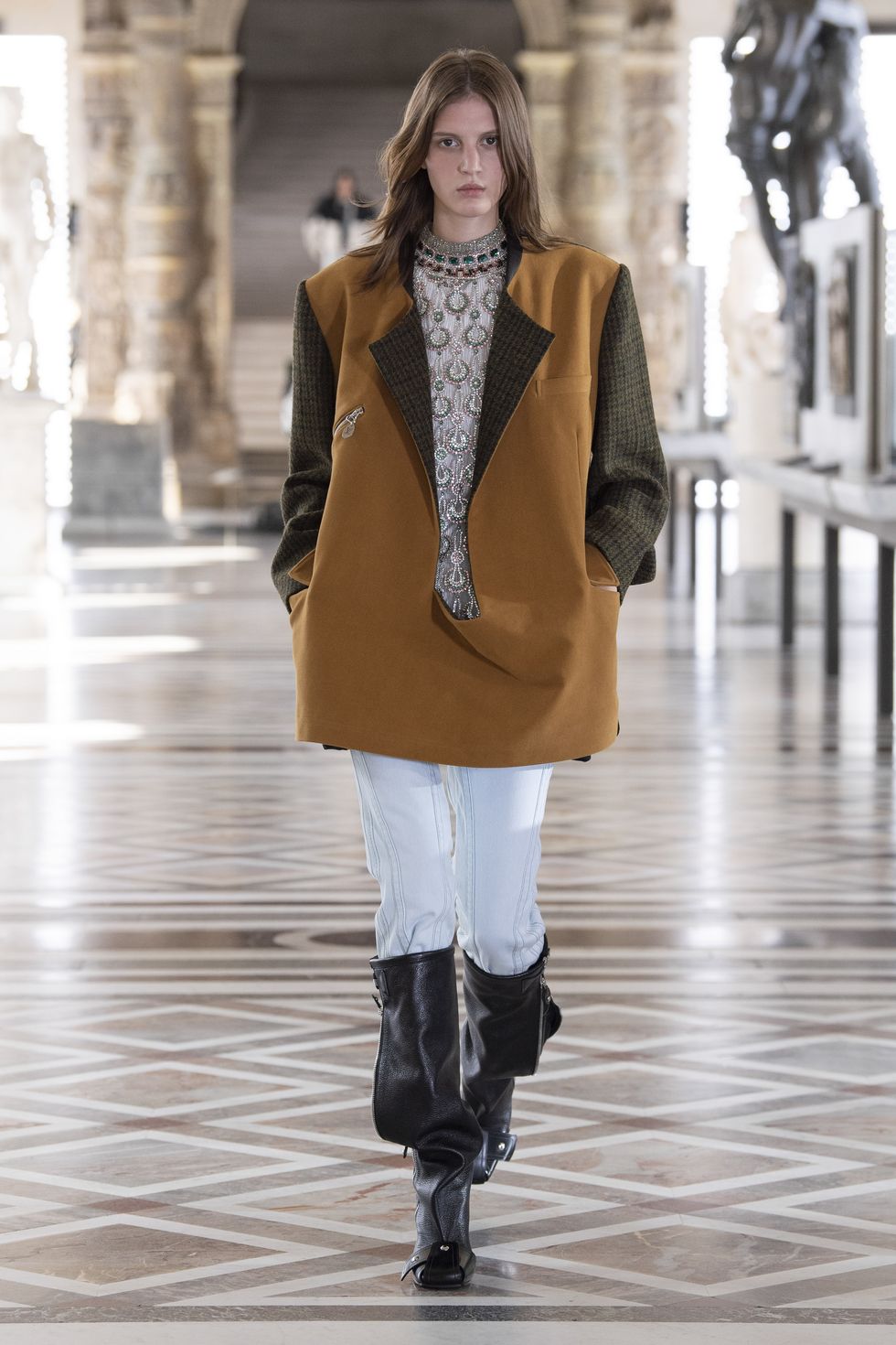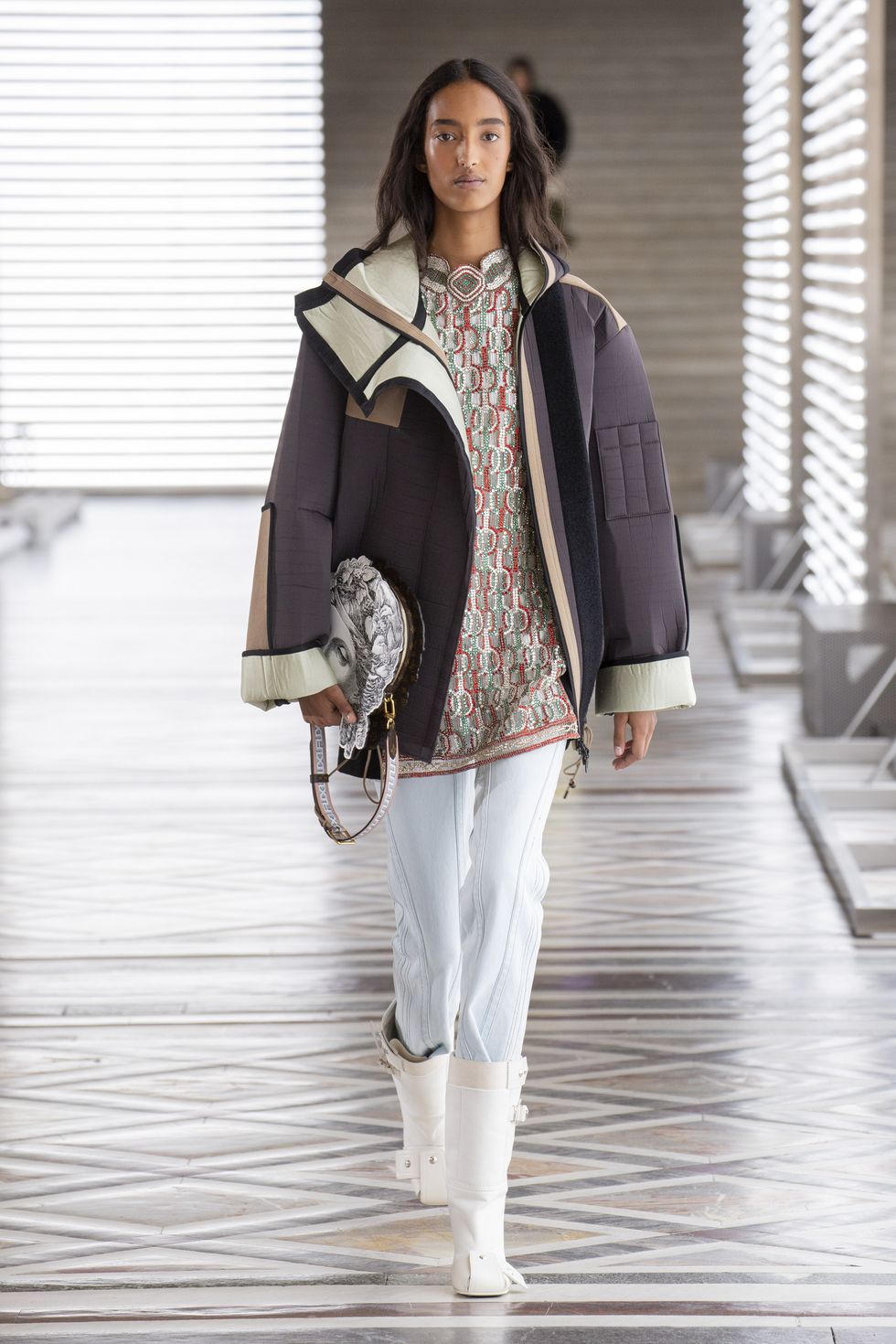 Koleksioni i vjeshtës, i Louis Vuitton nuk kufizohet në ngjyra, printime dhe tekstura, kryefjala është të guxosh. Veshjet rikthejnë të shkuarën dhe nga ana tjetër, paraqesin vizion futurist. Veshje të ngarkuara, kombinime të guximshme ngjyrash, çizme të ekzagjeruara por praktike, janë disa nga elementët që do të vëreni në foto galerinë e mëposhtme. Ndërsa nuk mund të shkojmë drejt rrënojave të Greqisë Antike, ne mund ta shohim koleksionin e Louis Vuitton, që ngjall shijen e antikes. Burimi: Elle