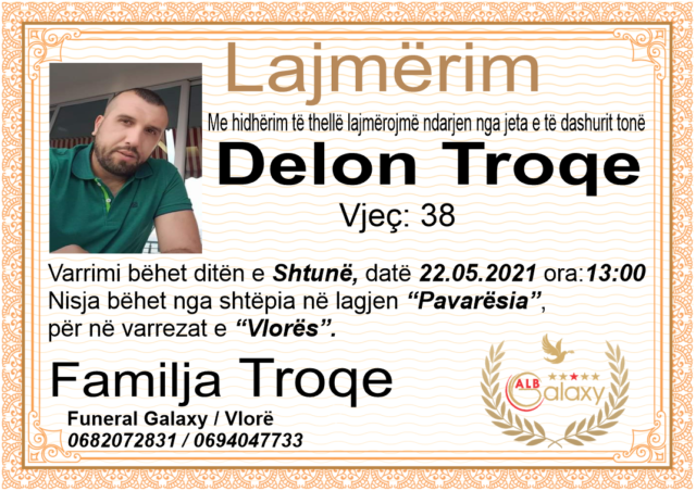38-vjeçari Delon Troqe që u e kzekutua mbrëmë me a rmë z jarri në një a tentat përpara servisit të tij në Vlorë do të përcillet ditën e sotme për në banesën e fundit.