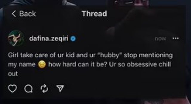 “Goce kujdesu për fëmijën dhe “burrin” tënd. Boll ma përmende emrin. Kaq e vështirë është? Je e fiksuar, qetësohu”, shkruan Dafina.