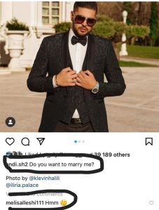 Andi dhe Melisa janë parë së bashku në Tiranë madje kanë postuar edhe foto me njëri-tjetrin. Së fundmi, ish-konkurrenti ka bërë një koment epik në një nga fotot e Melisës ku i kërkon asaj dorën për martesë. “A do të martohesh me mua” -shkruan Andi në Anglisht ndërkohë që Melisa i ka kthyer një përgjigje duke lënë të nënkuptohet se do të mendohet.