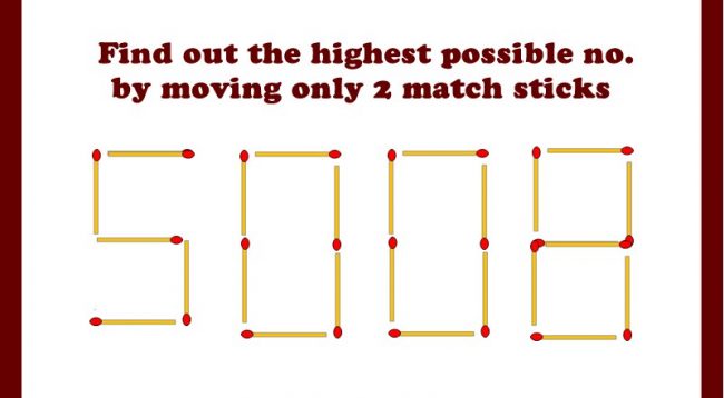 Numri 5008 është shkruar me shkopinj të vegjël. Sfida është për të gjetur numrin më të lartë të mundshëm duke lëvizur vetëm 2 shkopinj. Mund të bëni atë? Provoje tani!