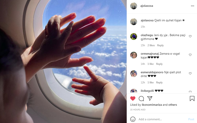 Vendin se ku nuk e dimë, por Ajola zgjodhi të postojë një foto shumë të ëmbël nga avioni ku shfaqet dora e saj që prek xhamin dhe dora e vockël e Kajanit që prek mamin teksa të dy shijojnë pamjen mes reve.