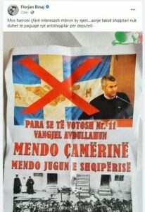 “Para se të votosh Nr.11, Vangjel Avdullahun, mendo Çamërinë. Mendo Jugun e Shqipërisë”, shkruhet në postera. Kësaj nisme i bashkohet dhe Binaj, i cili ndan një nga këto postera dhe shkruan: “Mos harroni çfarë interesash mbron ky njeri….asnje taksē shqiptari nuk duhet të paguajë një antishqiptar për deputet!”