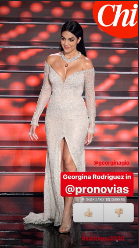 Georgina është gruaja e Cristiano Ronaldos dhe unë dyshoj se do ishte në Sanremo nëse nuk do ishte gruaja e tij. Ky status, pra të qënurit “gruaja e Ronaldos” i jepte asaj një dozë ftohtësie, vetëbesimi, ngadalësie, deri edhe mendjemadhësie. Ajo ishte e bindur që “e kishte nderuar Sanremon” me pjesëmarrjen e saj. Burri i famshëm e ndiqte nga vetëm 5 m larg si për t’i thënë “ Ne jemi shkëlqimi, Sanremo po merr nga ne”. E ndihmonte për këtë edhe sjellja inferiore e drejtuesit ndaj Ronaldos, kamerat që e ndiqnin me vëmendje. Kukulla e Ronaldos kërceu tango sensuale duke treguar edhe aftësi të tjera përveç bukurisë marramendëse por kurrë nuk u shkri e u bë njësh me Sanremon. Sepse Sanremo dhe Georgina ishin dy lëndë me pesha specifike të ndryshme, ata nuk shkriheshin dot. Njëri i ndrojtur e tjetri arrogant ishin si uji me vajin, një bashkim mekanik që nuk ka reaksion kimik. Bukuria e saj e ftohtë dhe artikulimi pa emocion por plot vetëbesim nuk e ndihmuan atë të merrte vëmendjen e pritur prej fillimit. Sanremo për të do të thoshte një festival i rëndomtë kënge në një vend që e ka lidhur puna e të shoqit.
