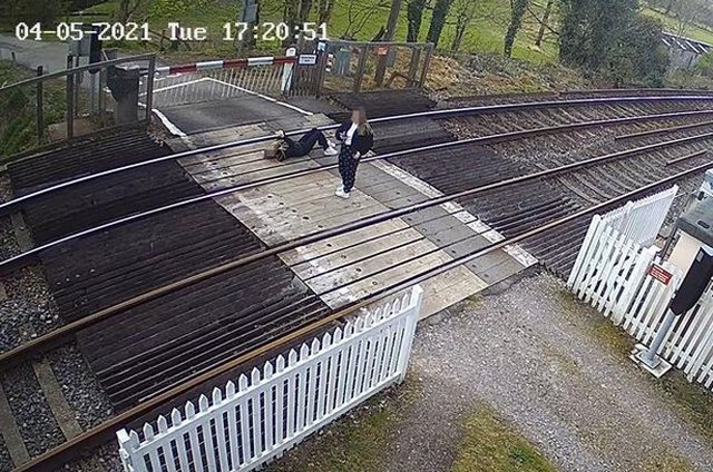 Në Angli, një vajzë me telefon në dorë shtrihet në shinat hekurudhore ku trenat mund të arrijnë shpejtësi deri në 85 milje për orë. Bashë me të është edhe një vajzë tjetër, e cila në këmbë e shikon për veprimin e rrezikshëm që bën.