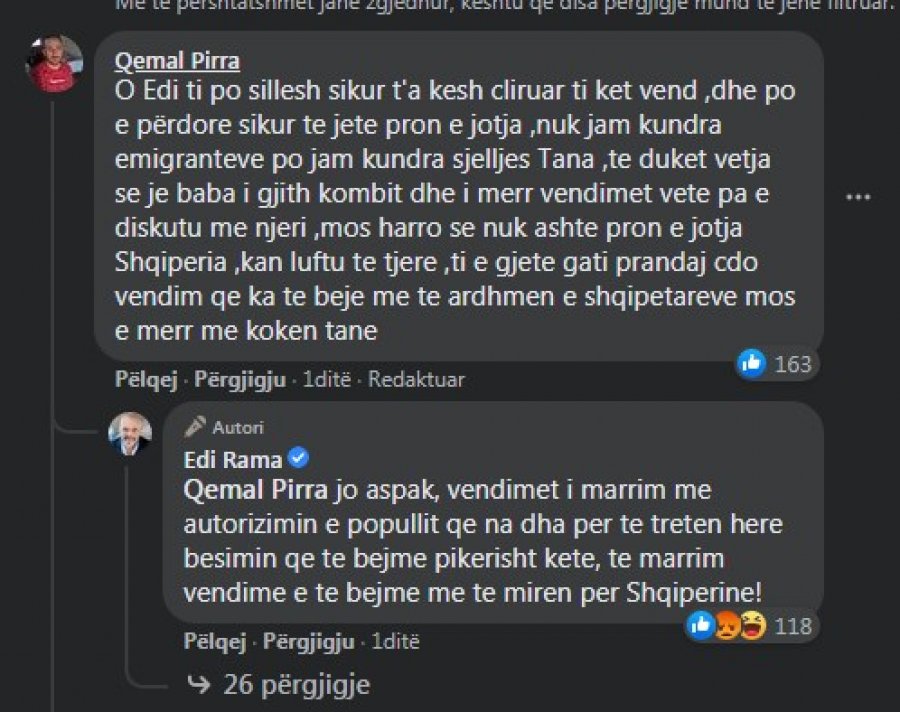 Kryeministri nga ana e tij është kundërpërgjigjur “flakë për flakë”, por duke pretenduar se për këtë vendim ka autorizim nga populli. Qemal Pirra jo aspak, vendimet i marrim me autorizimin e popullit qe na dha per te treten here besimin qe te bejme pikerisht kete, te marrim vendime e te bejme me te miren per Shqiperine!’, shkruan Rama.TPZ