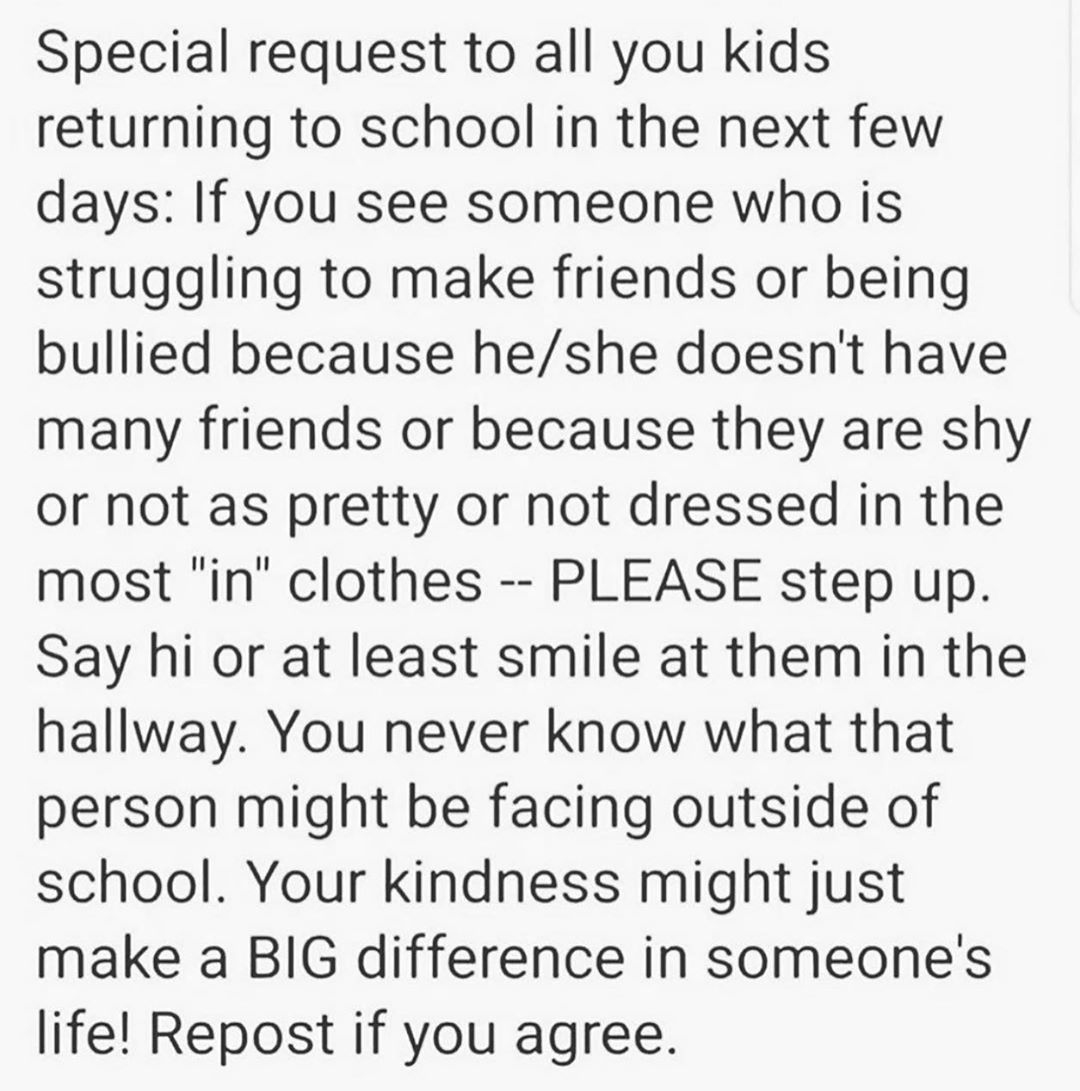 Ai ka shpërndarë në Instagram një postim: “Kërkesë e veçantë për të gjithë ju që riktheni në shkolla në ditët në vazhdim: nëse shihni dikë që ka vështirësi të bëjë miq or po e tallin sepse nuk ka aq shumë shokë ose sepse është i turpshëm ose jo dhe aq i bukur ose nuk ka veshur rrobat më “in”- ju lutem i dilni në krahë. Përshëndeteni ose të paktën i buzëqeshni nëpër korridore. Asnjëherë nuk mund ta dini se çfarë ai person mund të jetë duke kaluar jashtë shkollës. Mirësjellja jotë mund të bëjë një diferencë të madhe në jetën e dikujt.”