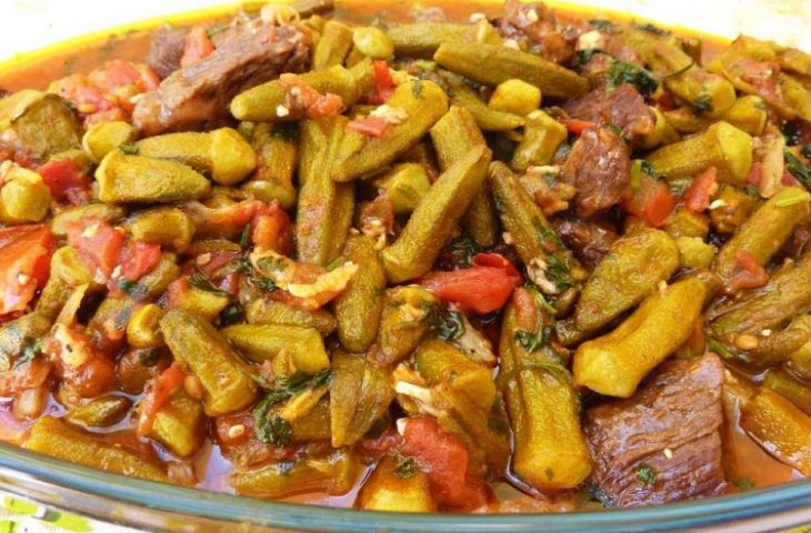 Sipër vihen feta domateje, mbulohen me pjatë, u hidhet lëng mishi ose ujë dhe zihet derisa gjella të mbetet me pak lëng. Për të mos i’u prishur forma bamjet gjatë shërbimit kthehen në tepsi duke i përmbysur.