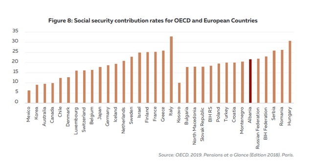 Norma totale e kontributit të Shqipërisë prej 21.6 për qind është afër mesatares evropiane prej 21 për qind dhe më i lartë se, norma e vendeve në Organizatën e Bashkëpunimit dhe Zhvillimit Ekonomik (OECD) mesatare prej 18 për qind. Duke pasur parasysh pagat shumë të ulëta të punonjësve shqiptarë, masa e kontributeve nuk mjafton për të paguar shumën totale që duhet për pagesën e pensioneve.