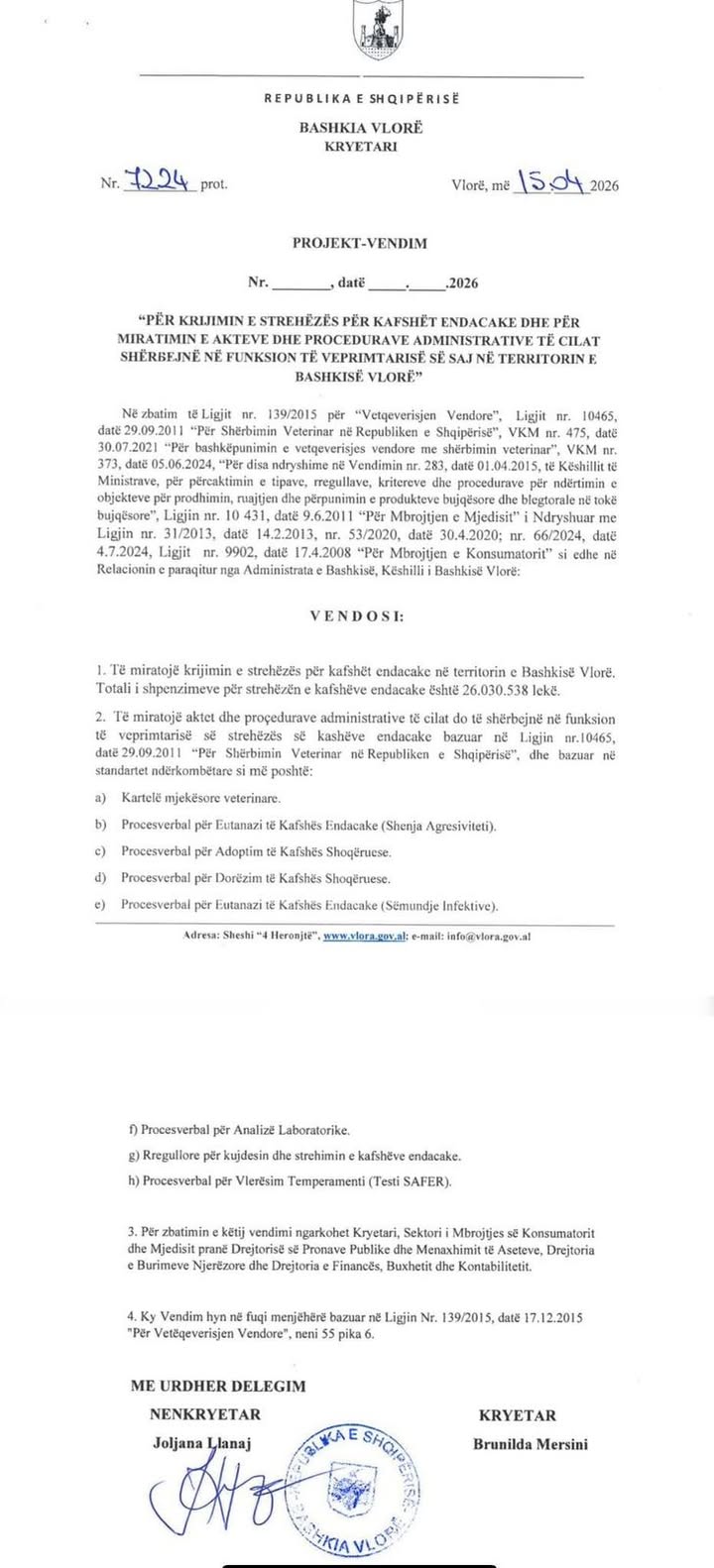 Bashkia Vlorë ka paraqitur një projekvendim për ngritjen e një strehëze për qentë endacakë, me kapacitet prej 100 qenësh, ku parashikohet jo vetëm strehimi, por edhe ushqimi, vaksinimi dhe hospitalizimi i tyre. Si koncept, kjo është një nismë pozitive dhe e domosdoshme për një qytet që synon standarde më të larta në menaxhimin e hapësirave publike dhe sigurisë.