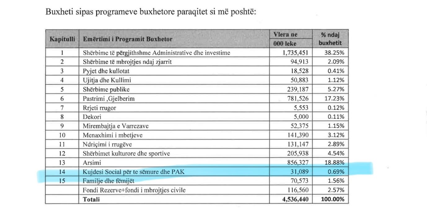Në të njëjtën kohë, në buxhetin e miratuar për vitin 2026, Bashkia Vlorë ka parashikuar për kujdesin social ndaj shtresave në nevojë dhe personave me aftësi të kufizuar një fond prej 310,000 euro, ose vetëm 0.69% e buxhetit total.