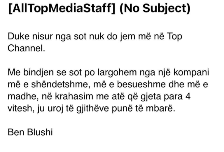 Ben Blushi ka dhënë dorëheqjen nga drejtor i përgjithshëm i Top Channel. Blushi u ka dërguar punonjësve të TCH këtë e-mail: “Duke nisur nga sot nuk do jem më në Top Channel. Me bindjen se sot po largohem nga një kompani më e shëndetshme, më e besueshme dhe më e madhe në krahasim me atë që gjeta para katër vitesh, ju uroj të gjithëve punë të mbarë. Ben Blushi,”- shkruhet në e-mail.