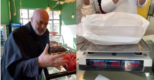 Edi Rama: Hajt’ peshoje ta shohim. Masivja e bardhë? Kjo qenka 700 gram. Rëndësi ka që të jetë lëvizje e vogël, e natyrshme. Se është edhe psikologjike ëëëë. Është psikologjike. Janë të stresuar klientët.
