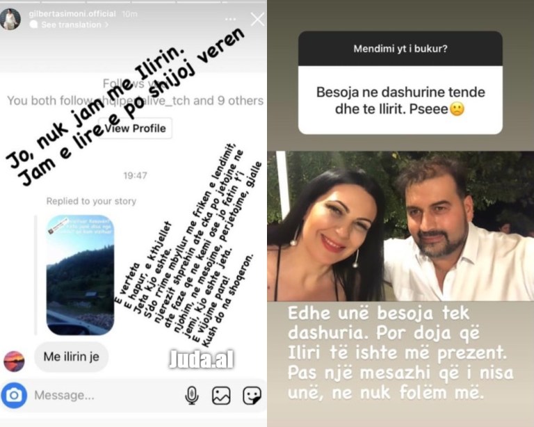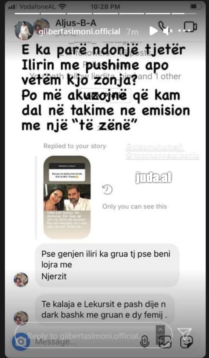 Gilberta rrëfen në llogarinë e saj Instragram nëpërmjet disa bisedave me Screenshot ku ndjékës të saj shprehen se Ilirin e kanë parë me gruan e tij dhe dy fëmijët tek kalaja e Lekursit.
