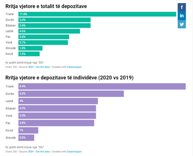 Fieri dhe Vlora ndërkohë regjistrojnë një rritje me 3.8% dhe 3.7% respektivisht. Ata që kanë kursyer më pak nga pandemia ndërkohë duket të jenë shkodranët dhe korçarët, me vetëm 1.8% dhe 1.6% rritje të depozitave.