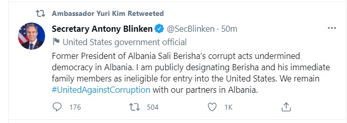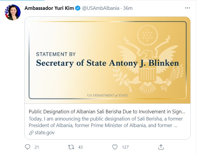 Në profilin e saj zyrtar në Twitter, diplomatja ka ripostuar vendimin e publikuar në faqen e internetit të DASH si dhe deklaratën e Sekretarit amerikan të Shtetit Antony Blinken.