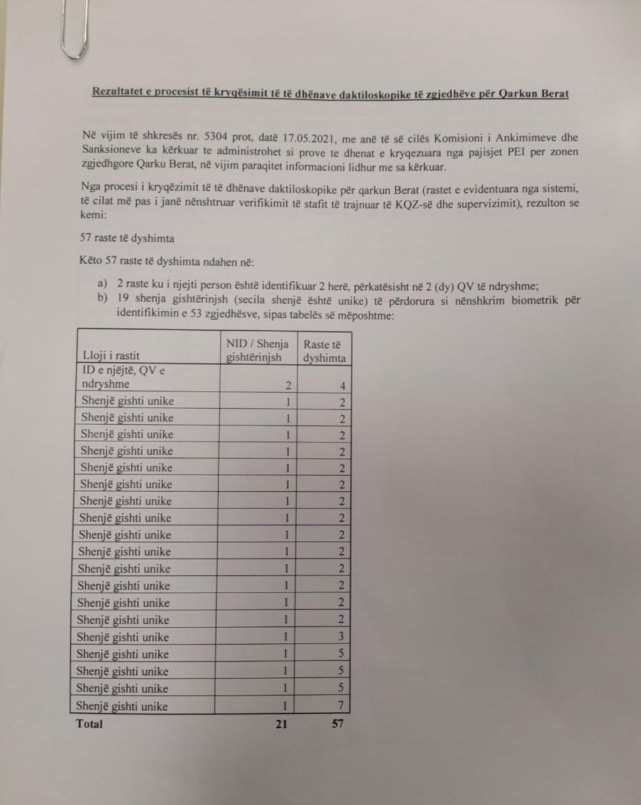 Kryqëzimi i të dhënave të shenjave të gishtave ka faktuar votimin e parregullt në qarkun e Beratit. 19 persona kanë votuar 53 herë, mes të cilëve dy persona kanë votuar dy herë.
