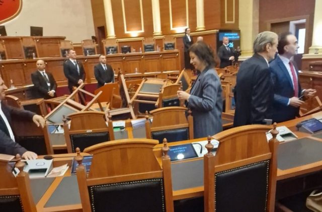 Deputetët e opozitës ka grumbulluar dhe përmbysur karriget në mes të sallës së Parlamentit.