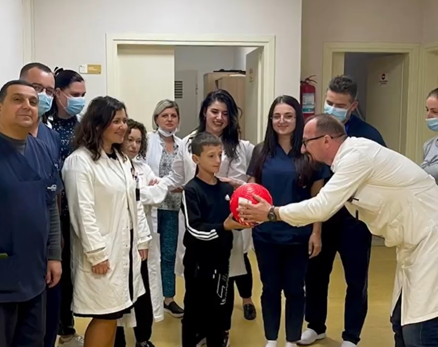 “Emocion i papërshkruar për Dionisin e vogël, i cili sapo përfundoi me sukses seancën e fundit të radioterapisë, u surprizua nga stafi i Njësisë së Radioterapisë në Spitalin Onkologjik, me një dhuratë që e ëndërronte një top me firmën e Cristiano Ronaldos CR7.
