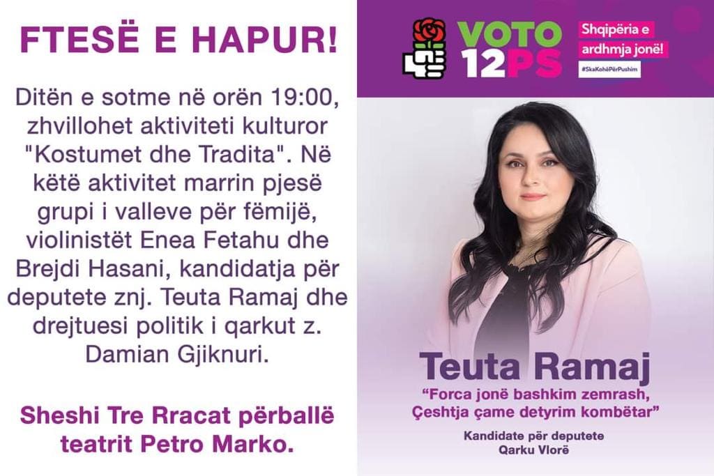 Marrin pjese kandidatja për deputete znj. Teuta Ramaj dhe drejtuesi politik i qarkut z .Damian Gjiknuri. Sheshi tre racat përballë teatrit Petro Marko.