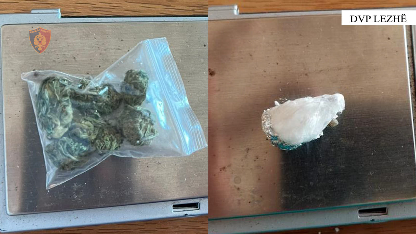-u arrestuan në flagrancë shtetasit shtetasit E. Gj. 19 vjeç dhe I. Sh. 28 vjeç, të dy banues në Lezhë, pasi gjatë kontrolleve fizike iu gjetën sasi lëndësh të dyshuara narkotike kokainë dhe cannabis sativa, të ndara në doza të gatshme për shitje;
