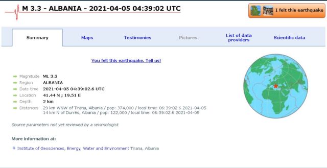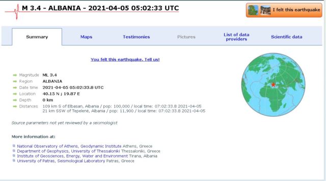 Mëngjesin e sotëm dy tërmete kanë goditur vendin tonë. Sipas EMSC, lëkundja e parë sizmike është regjistruar në orën 04:39.