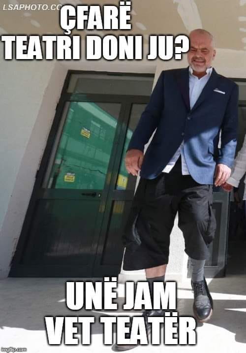 Dy fotot hit në rrjetet sociale: Edi Rama duke dalë nga votimet partiake të 30 qershorit 2019 dhe Ilir Meta duke dalë nga Gjykata Kushtetuese më datë 24 korrik 2019 pasi dorëzoi padinë ndaj ligjit që ka miratuar kryeministri Rama për shembjen e Teatrit Kombëtar.