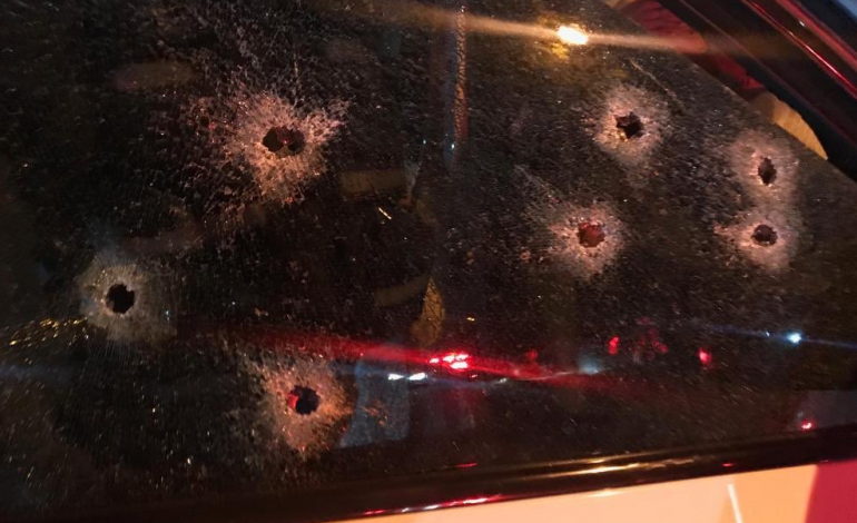 Në fotografitë e publikuara nga vendi i ngjarjes shihet qartë se si autorët kanë su lmuar bar barisht ish-futbollistin, ku 7 pl umba kanë përfunduar në xhamin e parë të makinës.