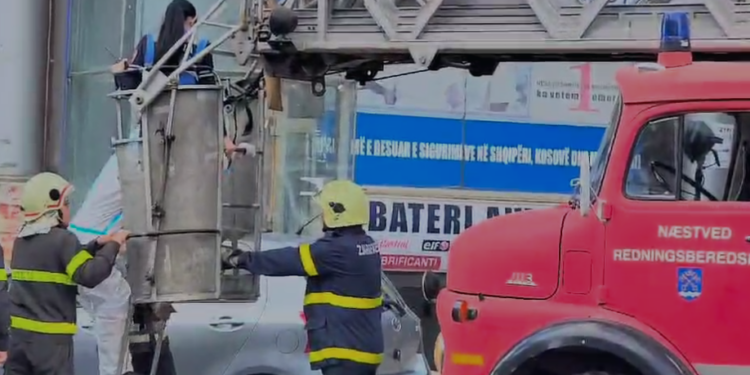 Trupi i pajetë po tentohet te zbritet me koshin e automjetit zjarrfikës nga tarraca.