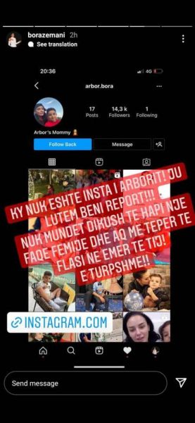 Çështja ka të bëjë me hapjen e një “Instagrami” të rrejshëm në emër të djalit të saj Arborit. “Ky nuk eshte insta i Arbori! Ju lutem beni report!!! Nuk mundet dikush te hapi nje faqe femije dhe aq me teper te flasi ne emer te tij! E turpshme!!, ka shkruar Zemani.