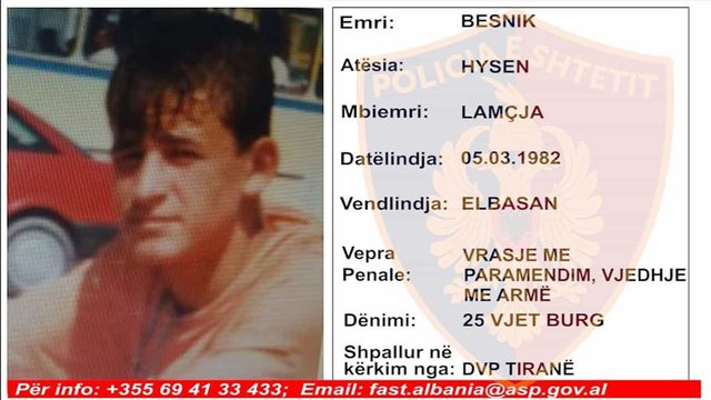 Ky shtetas është shpallur në kërkim ndërkombëtar pasi Gjykata e Posaçme e Shkallës së Parë Tiranë e ka dënuar me 25 vjet burgim, për veprat penale “Vrasja me paramendim” kryer në bashkëpunim, “Vjedhja me armë”, kryer në bashkëpunim dhe “Mbajtja pa leje dhe prodhimi i armëve, armëve shpërthyese dhe i municionit”.