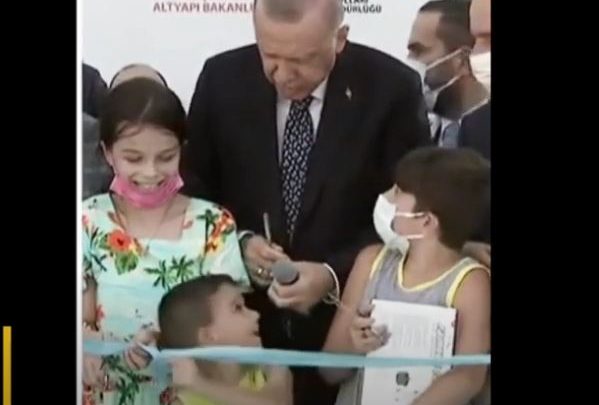 Më pas Presidenti i Turqisë shihet të flasë dhe me dy vajzat që ndodhen anash të voglit, ndodhta duke i kërkuar llogari për shiritin e prerë. Fëmijët nisin të qeshin, por fytyra e djaloshit pas goditjeve në kokë, tregon se nuk i shijoi dhe aq ai moment.