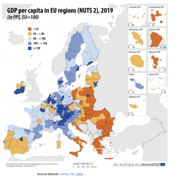 PBB-ja e lartë për frymë në këto rajone mund të shpjegohet pjesërisht nga një fluks i lartë i punëtorëve që udhëtojnë (Luksemburg, Pragë, Bruksel dhe Hamburg) ose nga pasuritë e mëdha kapitale të zotëruara nga disa kompani shumëkombëshe me vendbanim në disa rajone (psh Midland në Irlandë) ) Në të kundërt, zona Veri-Perëndimore në Bullgari dhe Mayotte (të dy 32% e mesatares së BE), janë rajonet më të ulëta në renditje.