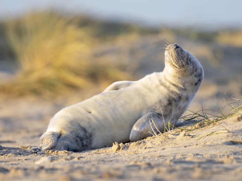 Foka është shtrirë në breg të detit e duket se po shijon rrezet e diellit. Fotografitë janë realizuar nga Johan Siggeson në Horsey Beach, Norfolk, ku shpesh vihen re foka të tilla, të vogla.