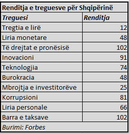 Dy treguesit ku Shqipëria ka renditjen më negative janë të drejtat e pronësisë dhe barra e taksave, ku Shqipëria renditet e 102-a. Problemi i tretë është mungesa e inovacionit (91) dhe në vend të katërt është korrupsioni (81). Më mirë paraqitet në tregtinë e lirë (e 12-a) dhe mbrojtjen e investitorëve (e 25).