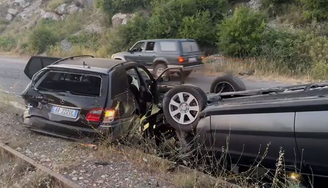 Përplasja duket e fortë aq sa njëri prej mjeteve është përmbysur me gomat lart.