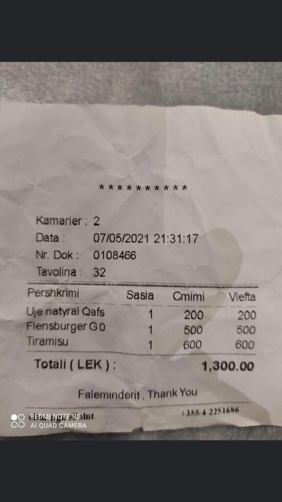 Më poshtë shihni faturën në një prej lokaleve të Sarandës ku vetëm çmimi i tiramisus kushton 600 lekë.