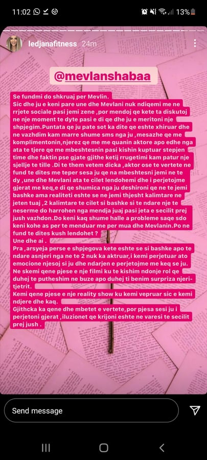 “Se fundmi do shkruaj per Mevlin. Sic dhe ju e keni pare une dhe Mevlani nuk ndiqemi me ne rrjete sociale pasi jemi zene ,por mendoj qe kete ta diskutoj ne nje moment te dyte pasi e di qe dhe ju e meritoni nje shpjegim.