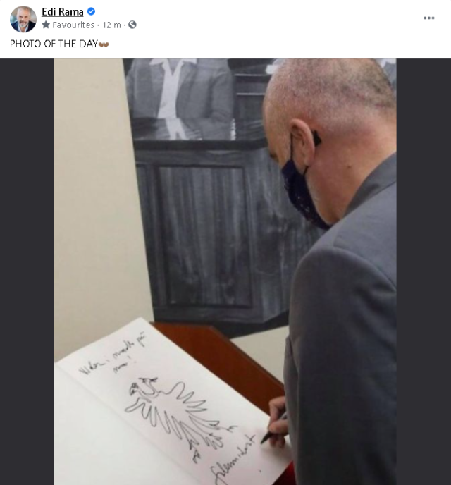 Teksa ka qenë prezent në aktivitetin e organizuar ditën e sotme në Akademinë e Shkencave, kryeministri Edi Rama ka lënë edhe në shënim. Ai ka publikuar një foto teksa shfaqet me një lapustil duke vizatuar me dorë shqiponjën dy krenare ndërsa në dy skajet e saj ka shkruar “Nderi më i për mua”. Në fjalën e tij në Akademinë e Shkencave Rama deklaroi se më në fund ky institucion është çliruar për të konkretizuar punën e saj në profil të mirëfilltë shkencor.