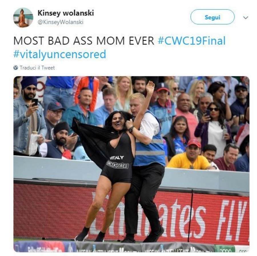 Modelja Kinsey Wolanski është duke shijuar famën e saj. Bukuroshja polake ishte në qendër të vëmendjes pasi arriti që të futej në fushë gjatë finales së Championsit, mes Liverpoolit dhe Tottenhamit. Wolanski arriti t’i bënte të gjithë për vete, duke u shndërruar në një personazh publik në media dhe rrjetet sociale. Por teksa mijëra tifozë ndiqnin ndeshjen e rëndësishme mes Anglisë dhe Zelandës së Re gjatë finales së Kupës së Botës një tjetër suprizë ka pushtuar stadiumin. Kësaj radhe nuk ishte bukuroshja ruse Kinsi Volanksi, por vjehrra e saj. Nën gjurmët e nuses, e veshur me rrobebanjo në ngjyrë të zezë, nëna e Vitali Zdorovetksi është futur në stadium teksa në rrobat e saj reklamonte faqen e djalit. Ka qenë vetë modelja ruse, Kisni Volanks që ka publikuar një foto të vjehrrës së saj, sipër të cilës shkruan: “Mamaja më e paparë”.