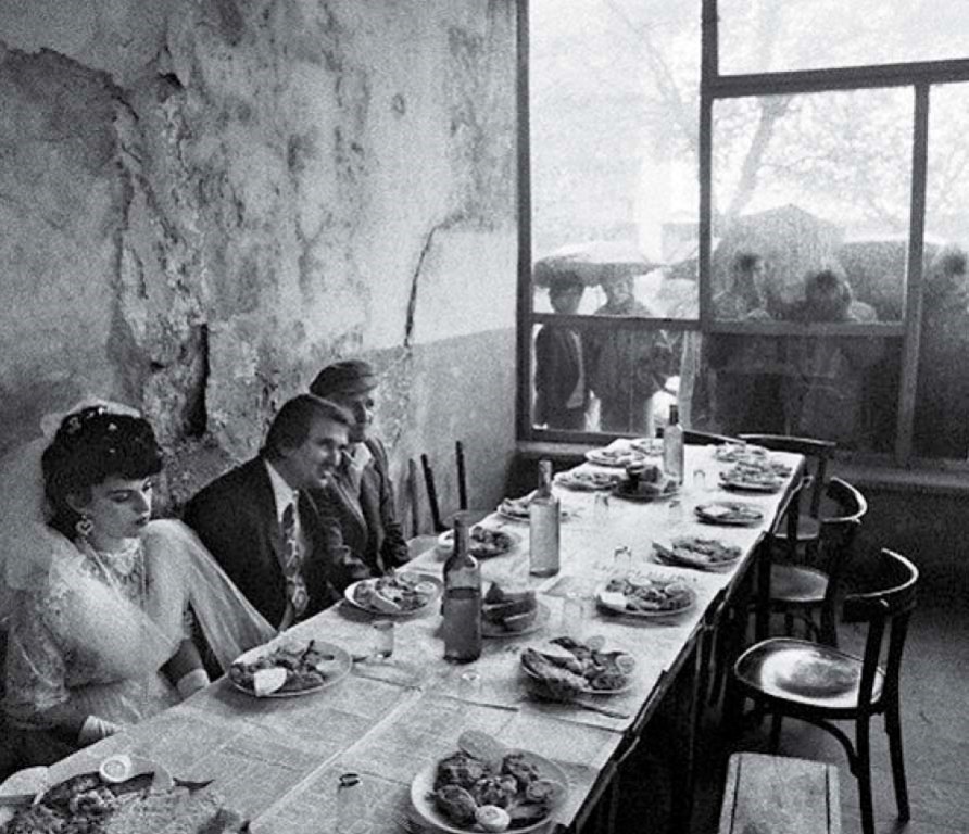 Pamje nga një dasmë në një mensë punëtorësh apo magazinë tregtie me arka e kuti boshe e improvizuar si lokal, ku duket nusja me fustan të bardhë që rri e menduar e dhëndrri me flokë të gjata që nuk e ka fare mëndjen te ajo…, por nga jati që ka në krah dhe me kasketën që ende nuk e ka hequr nga koka, ku të dy vështrojnë tej sallës së atij lokali, ndoshta në pritje të ardhjes së krushqve, të cilëve u janë lënë vëndet bosh në tryezën e tyre e mbushur me “gjithë të mirat”, ku duken dy tre karrige të vjetra dhe një stol i improvizuar ku pritet të ulen prindërit e nuses.