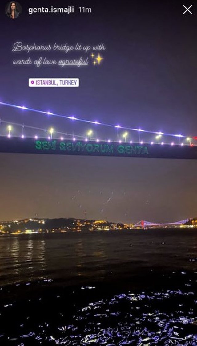 Genta Ismajli: Po më thoshte që duhet të dukesh shume bukur sot, vishu mirë sepse do të ta bëj një surprizë, po mendoja se çfarë surprize, do më çojë në darkë dhe kaq. Kemi dalë nga makina dhe kam parë një jaht të madh, më tha hajde hyjmë në këtë jaht. Ishte surprizë shumë e bukur, u gëzova sepse më pëlqejnë jahtat shumë, kur kam hyrë brenda kam parë një tavolinë të mbushur me lule, me ushqim të mirë, me të gjitha të mirat e Zotit kishin qenë aty. Një surprizë tjetër ishte kur erdhi një çun duke luajtur me violinë, këngë shumë të bukura romantike. Pastaj surpriza tjetër ishte kur emir im shkruhej në urën e Bosfoit.