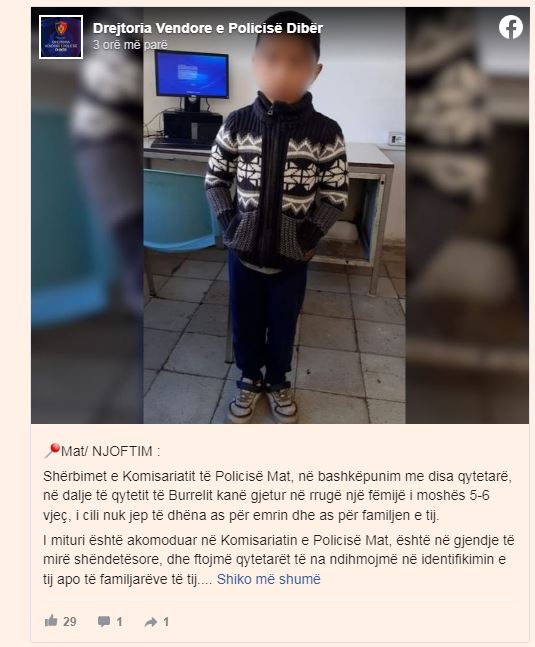 Drejtoria Vendore e Policisë Dibër njofton se ka gjetur sot një fëmijë të moshës 5-6 vjeç në dalje të Burrelit, ndërsa kërkon ndihmën e qytetarëve për identifikimin e të miturit, i cili është braktisur dhe nuk jep të dhëna për emrin e tij dhe as për familjen.