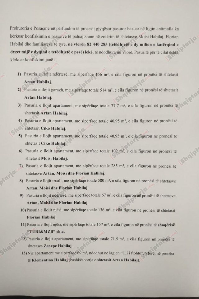 Gjykata e Posaçme konfiskon 22 pasuritë e Moisi Habilajt i d ënuar për t rafik d roge. SPAK kërkoi k onfiskimin e 22 pasurive të familjes Habilaj në kuadër të ligjit a ntimafia, pasi janë vënë nga paratë e ardhura nga trafiku i d rogës i kryer në Itali dhe Shqipëri. Pronat që janë konfiskuar janë të familjes Habilaj, përkatësisht; Ciko, Moisi, Artan dhe Florian Habilajt.