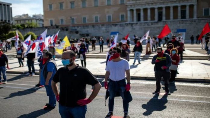 Disa qindra anëtarë të sindikatës komuniste PAME në Greqi dolën në demonstratë përpara parlamentit të Athinës, duke mbajtur distancë nga njëri-tjetri për të parandaluar përhapjen e koronavirusit. Shumica e demonstruesve mbanin veshur maska të kuqe, sipas TV Grek.