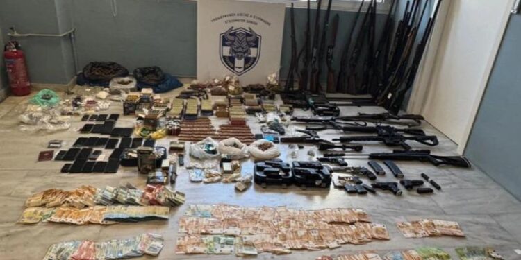 Pamjet e publikuara nga policia tregojnë një arsenal të plotë armësh, përfshirë pushkë gjysmë-automatike, armë lufte dhe pistoleta, si dhe sasi të mëdha municionesh, celularë, para në kartëmonedha euro dhe paketime me lëndë narkotike. Sipas vlerësimeve të policisë greke, të ardhurat totale të organizatës kriminale arrinin në rreth 3 milionë euro.