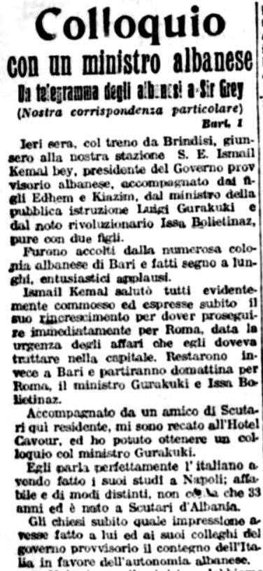 Bari, 1 prill. Mbrëmë, me trenin nga Brindizi, në stacionin tonë mbërriti Shkëkqesia e Tij Ismail Qemal beu, kryetar i qeverisë së përkohshme shqiptare, i shoqëruar nga djemtë e tij Et’hemi dhe Qazimi, nga ministri i arsimit publik Luigj Gurakuqi dhe nga revolucionari i njohur Isa Boletini, po ashtu me dy djemtë e tij.